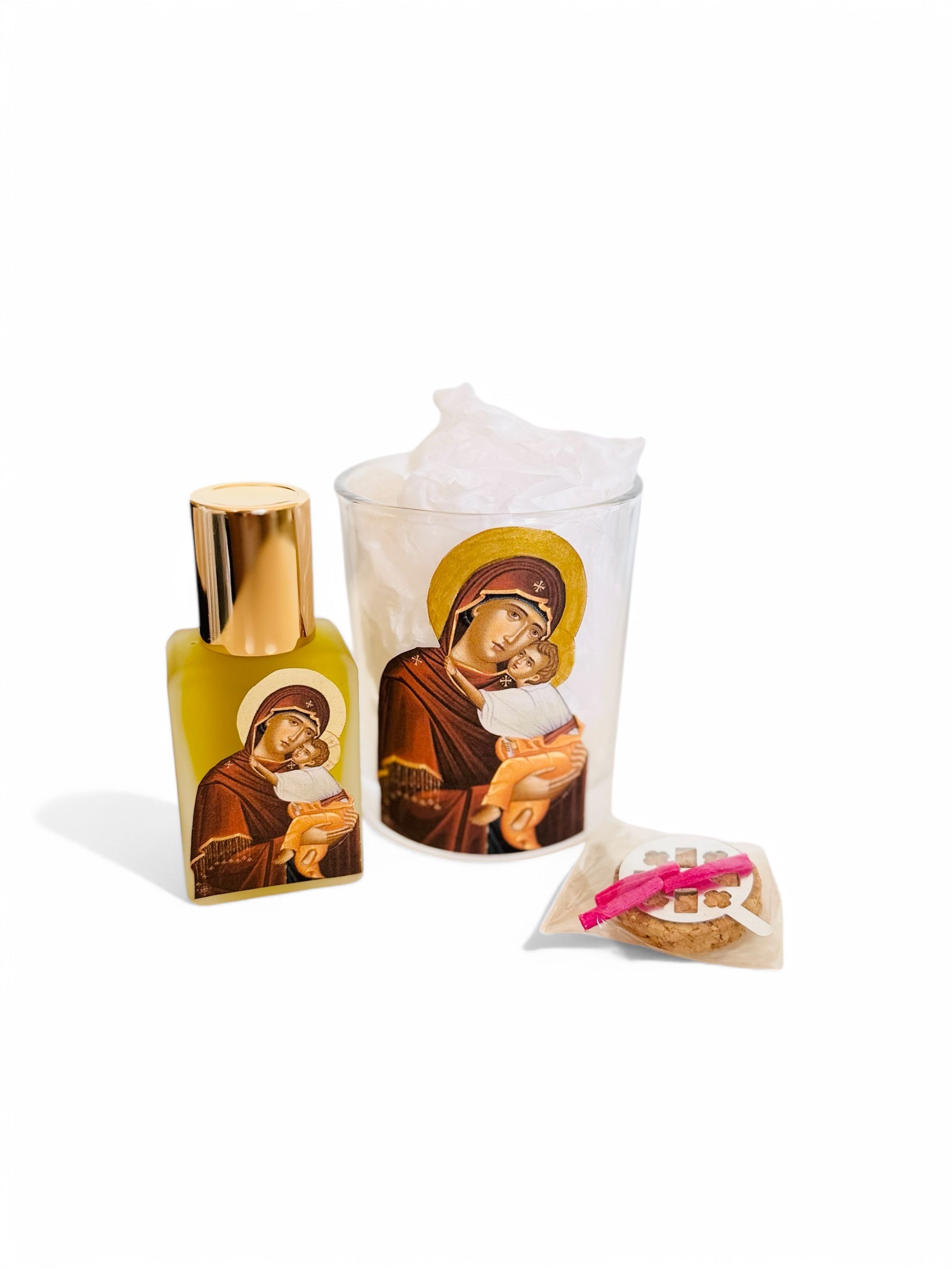 It includes 50ml of Holy Oil sourced from the revered Church of the Resurrection in Jerusalem, known for its blessings and divine significance. The set also features a beautifully crafted Kandili adorned with an image of the Panagia, providing a serene and peaceful atmosphere when lit. Accompanying the Kandili is a floating stand that allows it to be displayed with elegance, and a set of flints to ensure easy lighting.