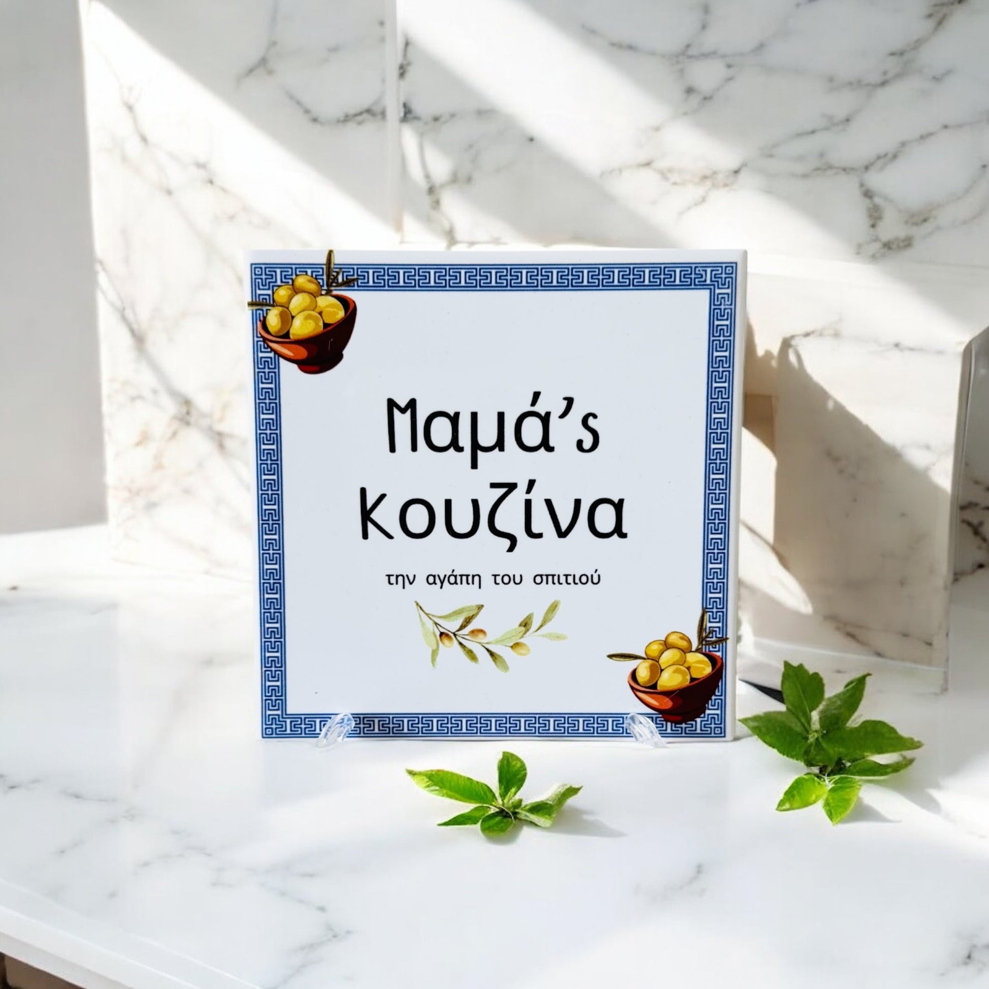 The Tile’s intricate Greek Key Pattern surrounds the text, representing Eternity and Unity, an iconic symbol from Ancient Greek art. The Olives symbolise Peace, Prosperity, and the Divine gift of Athena, who bestowed the Olive Tree upon Athens. They also represent connection to the Land, Resilience, and the enduring Cultural importance of Olive oil in Daily life 🫒