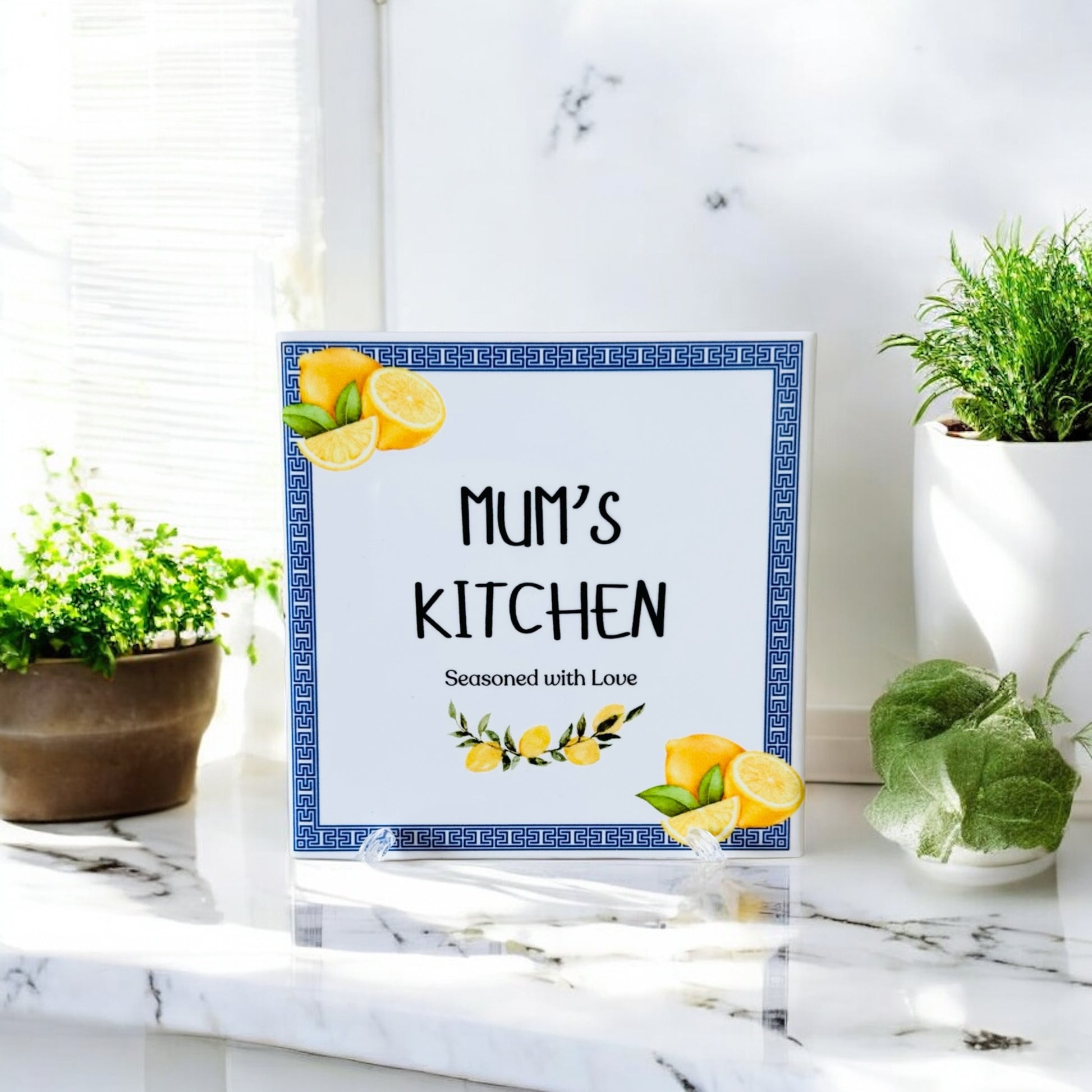 Bring the warmth of Greek tradition into your home with our 'Mum's Kitchen' Ceramic Tile, a beautifully crafted design that celebrates the Love and Passion behind every meal. The Tile features the heartfelt phrase "Seasoned with Love" in elegant typography, evoking the essence of Mediterranean cuisine and family!